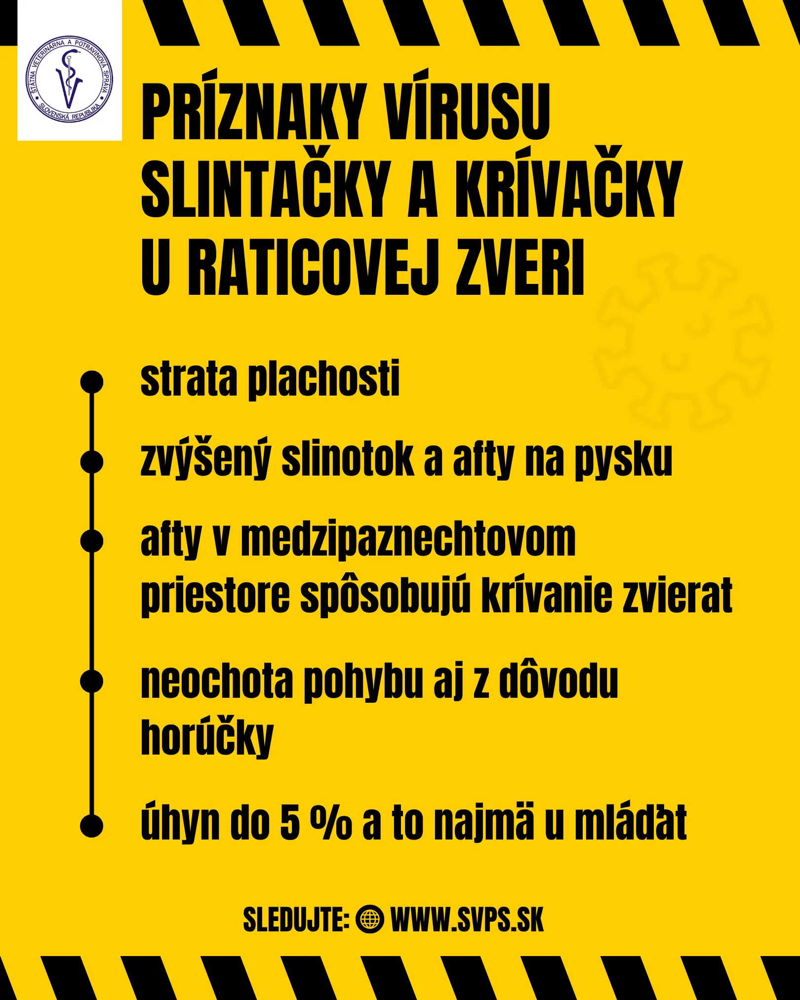 Dôrazne upozorňujeme chovateľov vnímavých zvierat uzatvoriť chovy, zabrániť prístupu cudzích osôb a dopravných prostriedkov do chovu, čo bolo aj plošne nariadené.