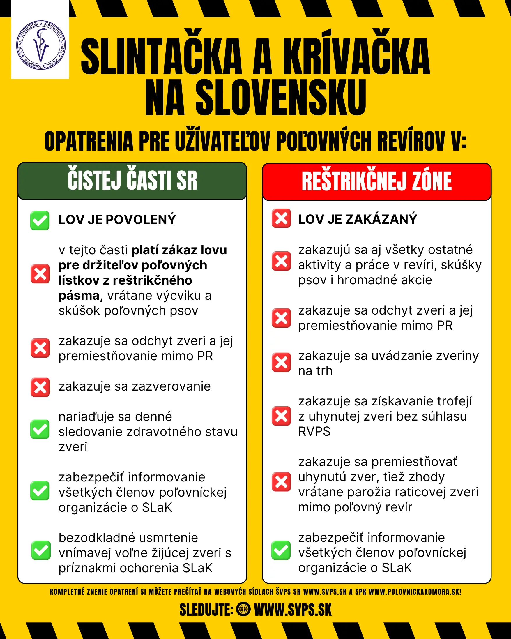 vykonávať lov zveri len držiteľmi poľovných lístkov, ktorí za posledných sedem dní neprišli do styku so zvieratami podozrivými alebo infikovanými slintačkou a krívačkou (ďalej len „SLAK“). Toto opatrenie platí aj na použitie poľovných psov;
