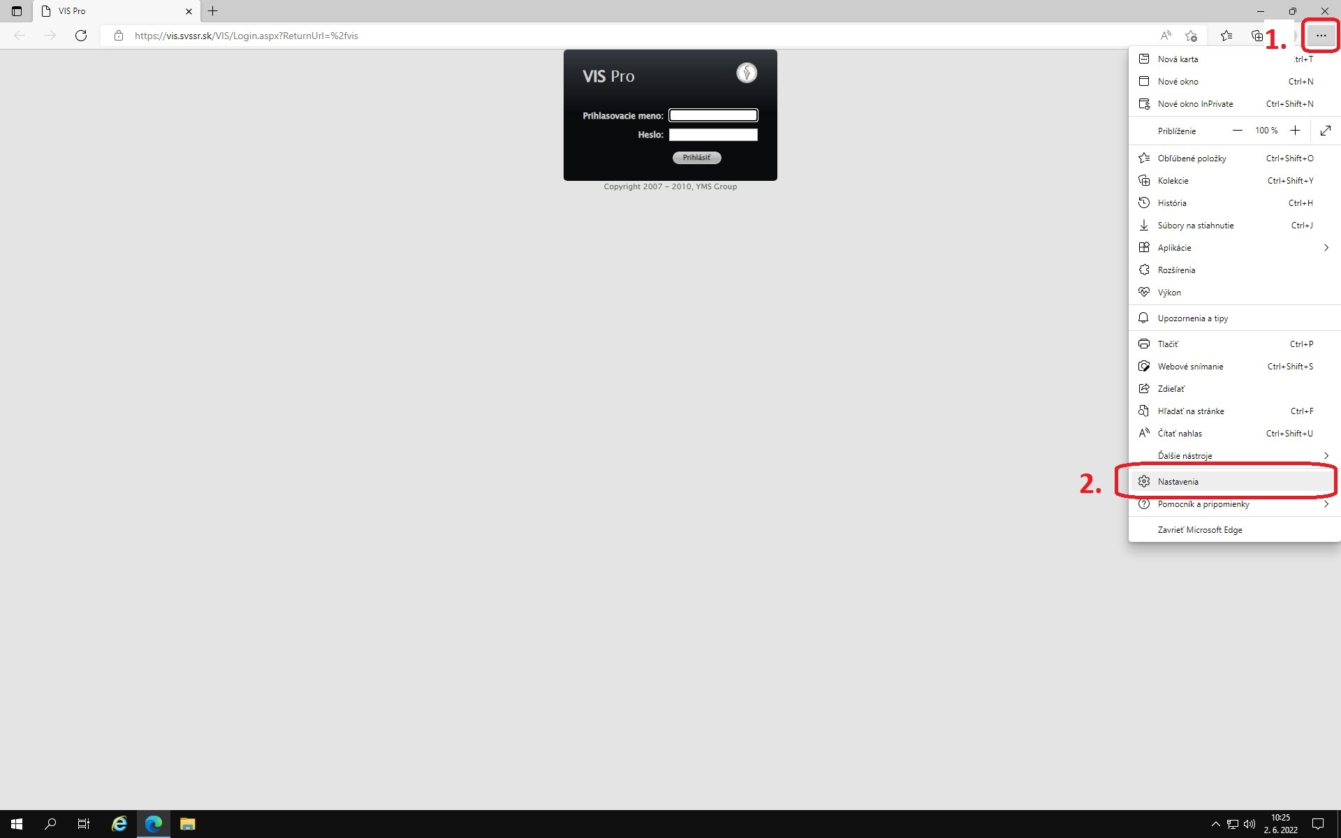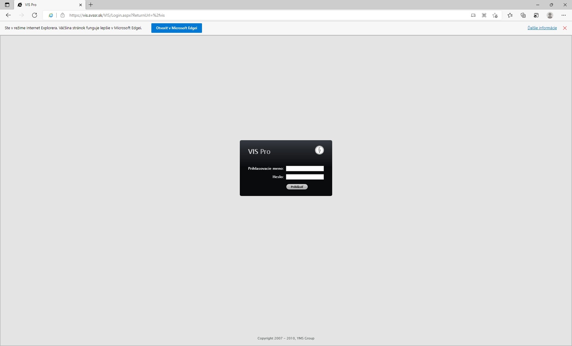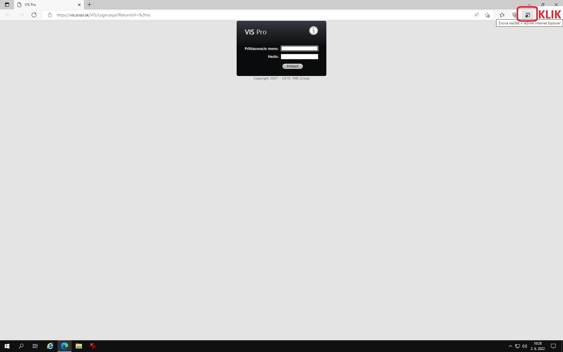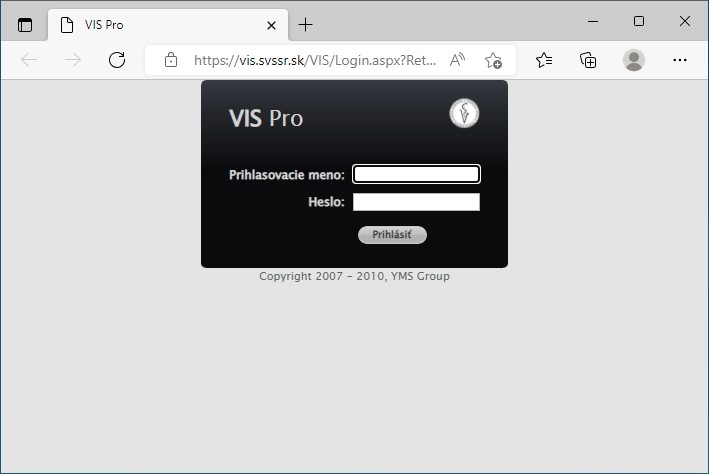 1 Otvorte VIS cez Microsoft Edge. Vidíme zle nastavený VIS v MS Edge (čierne okienko prihlásenia je na vrchu okna)