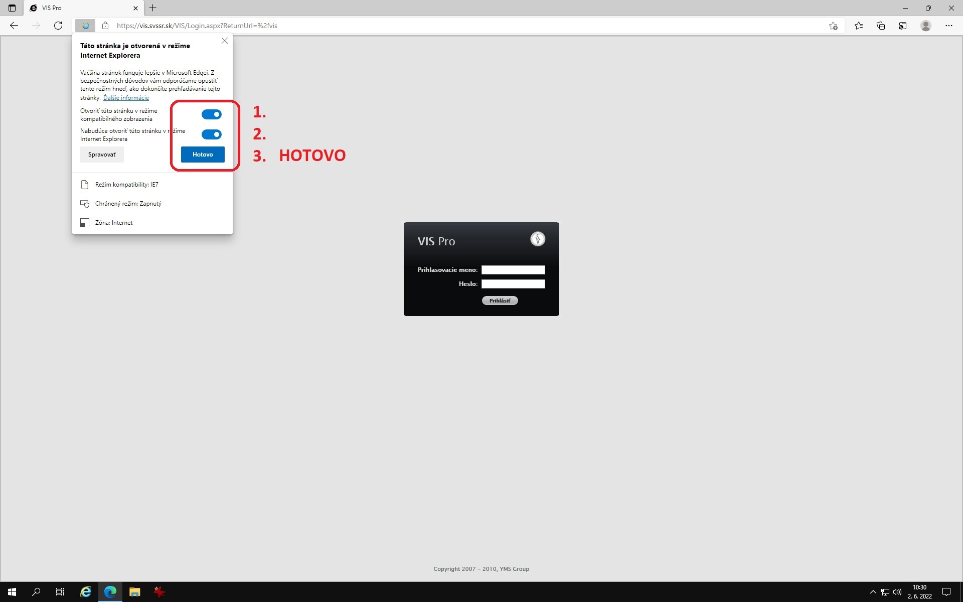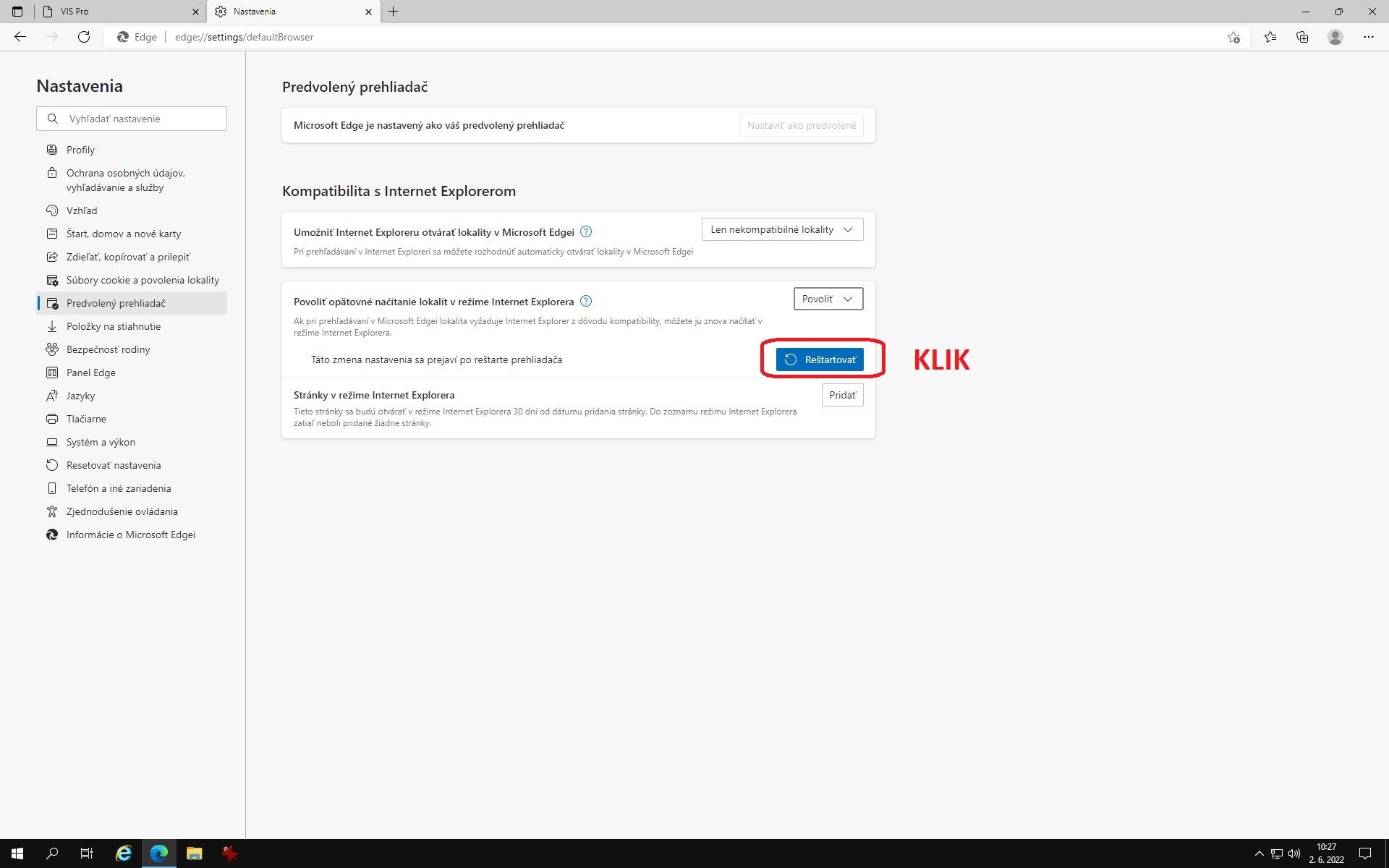 Pre prácu vo VIS je potrebné nastavenie režimu Internet Explorer v Microsoft Edge