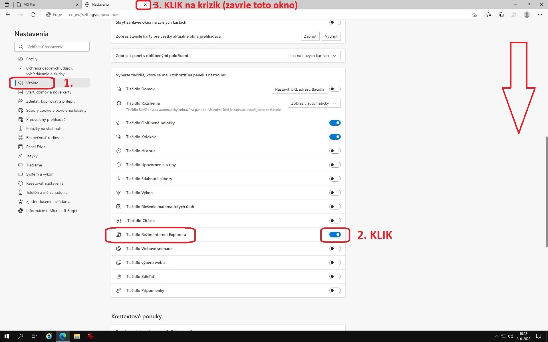 6 V ľavom stĺpci vyberieme „Vzhľad“ a posunieme sa myškou nižšie aby sme našli „Tlačidlo Režim IE“, klikneme na výber a hore krížikom zavrieme